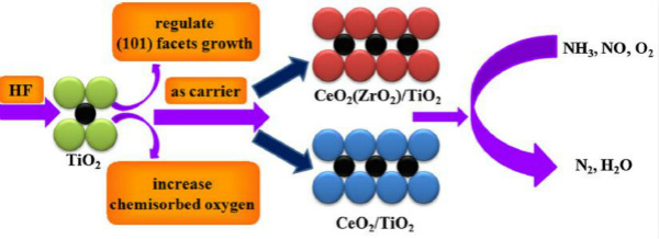 氮氧化物(NOx)是大气污染的主要原因之一,选择性催化还原(NH3-SCR)是目前烟气排放治理的主流技术。商业用V2O5/TiO2催化剂在促进NOx减排的同时,也易产生有毒固体废弃物,造成二次污染,因此研发利用选择性催化还原脱除NOx的环境友好型催化剂成为一种迫切需求。近期协同创新中心催化方向祝社民课题组利用F离子掺入调节TiO2高能(001)晶面暴露比,并将其应用于脱硝催化剂CeO2(ZrO2)/TiO2的制备。