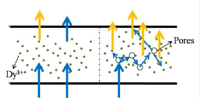 研究工作进一步就发光强度与显微结构之间的联系展开了讨论和研究。研究结果表明,陶瓷内部的气孔(第二相)形成的散射中心有效地提高了激发光源在荧光体内部的传播路径,增强了对激发光源的吸收,从而有利于发光强度(流明效率)的提升。这种显微结构与发光效率之间关系的建立为增强LED固态照明的流明效率提高了新的思路。相关的工作近期发表在J. Eur. Ceram. Soc., (DOI:10.1016/j.jeurceramsoc.2016.07.025)上。
