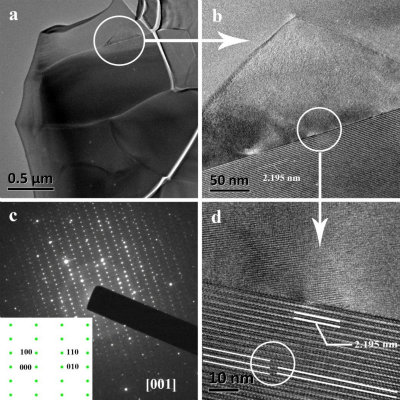 (c) 沿[001]晶带轴的选区电子衍射图 (d) 图 (b)的放大HRTEM图